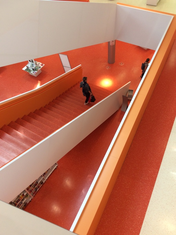 Biblioteka Brandenburskiego Uniwersytetu Technicznego w Cottbus o kształcie ameby i wyglądzie chmury, w wewnątrz znajduje się 7 kondygnacji przeciętych otwartymi przestrzeniami. Wnętrze biblioteki – jak gdyby środkowy pion stanowi otwarty księgozbiór. Charakterystycznym elementem, wyróżniającym wnętrze są spiralne schody w wyrazistych kolorach zieleni i purpury.