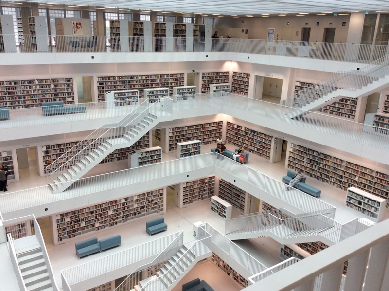 Biblioteka Miejska w Stuttgarcie, została zaprojektowana przez koreańskiego architekta Eung Young Yi. Na elewacji tego ogromnego, monolitycznego budynku słowo „biblioteka” zostało napisane w czterech językach – na północnej ścianie w języku niemieckim, zachodniej w języku angielskim, południowej w języku arabskim i wschodniej w języku koreańskim. Koncepcja architektoniczna przewidziała pomieszczenie o nazwie „serce biblioteki” nawiązujące do antycznej stylistyki.