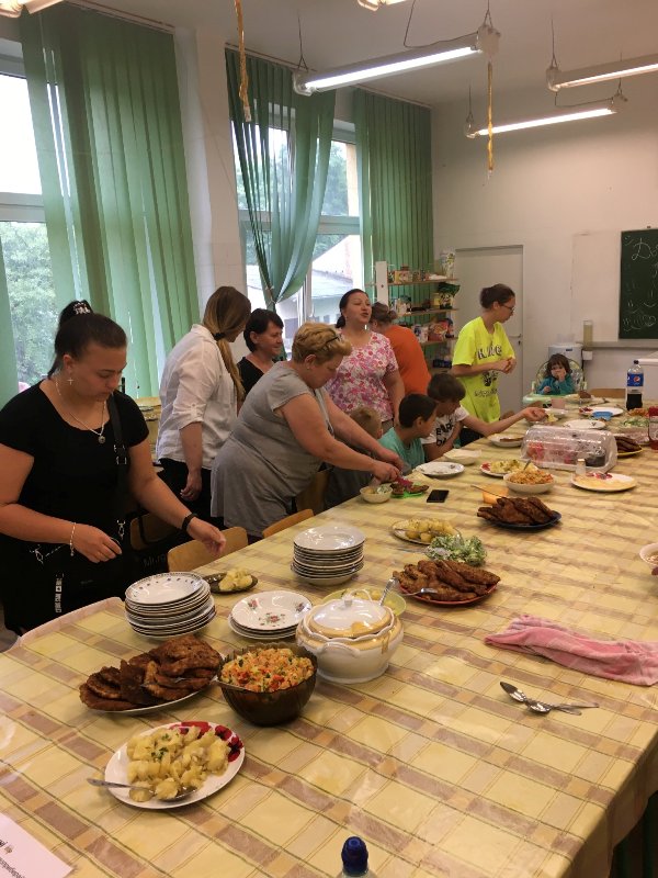 W sobotę 4 czerwca została zrealizowana pierwsza część projektu. Wraz z mieszkańcami punktu dla uchodźców z Ukrainy przygotowałyśmy wspólnie potrawy kuchni polskiej. Ugotowałyśmy tradycyjny obiad: zupę ogórkową, kotlet schabowy z młodymi ziemniaczkami, sałatę masłową ze śmietaną i surówkę z kapusty, a na deser racuchy drożdżowe z jabłkami i pyszną szarlotkę.