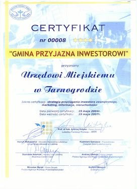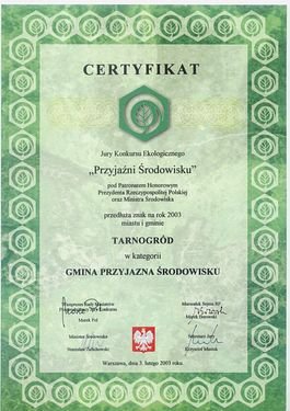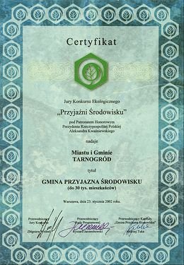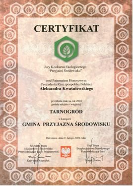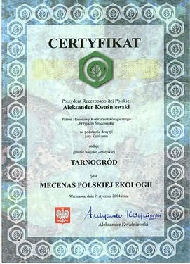 W 2004 r. roku przedłużyliśmy już po raz trzeci certyfikat „Gmina Przyjazna Środowisku" i będąc w gronie pięciu jednostek samorządowych w kraju, dnia 7 stycznia 2004 r. Prezydent RP Aleksander Kwaśniewski nadał naszej gminie tytuł „Mecenas Polskiej Ekologii".