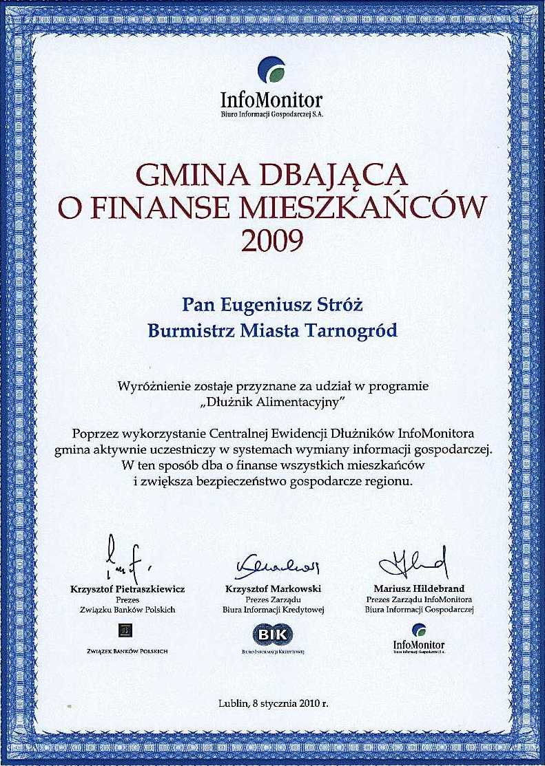 W 2003 roku, za wspieranie inicjatyw w dziedzinie ochrony środowiska Województwa Lubelskiego, otrzymaliśmy Dyplom Marszałka Województwa. Uczestniczyliśmy również w I Edycji Wielkiego Konkursu NFOŚiG „Nasza Gmina w Europie" uzyskując nagrodę w wysokości 200 tys. złotych, w dziedzinie gospodarki wodnej.