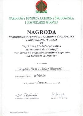 W roku 2001 za opracowanie i wdrożenie systemu selektywnej zbiórki odpadów, gmina otrzymała nagrodę Narodowego Funduszu Ochrony Środowiska i Gospodarki Wodnej w Warszawie za najlepszą realizację zadań w IV edycji „Konkursu na zagospodarowanie odpadów na terenach wiejskich". W III Edycji Ogólnopolskiego Konkursu Ekologicznego „Przyjaźni Środowisku" pod Patronatem Honorowym Prezydenta RP Aleksandra Kwaśniewskiego, otrzymaliśmy tytuł „Gmina Przyjazna Środowisku".