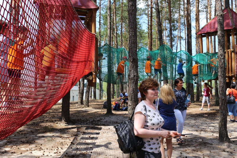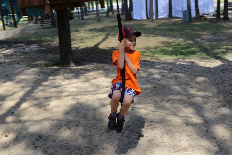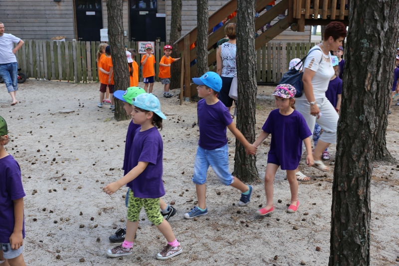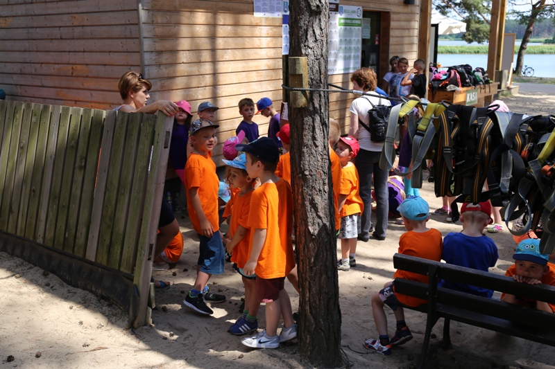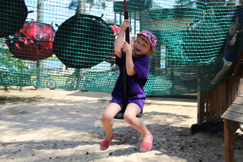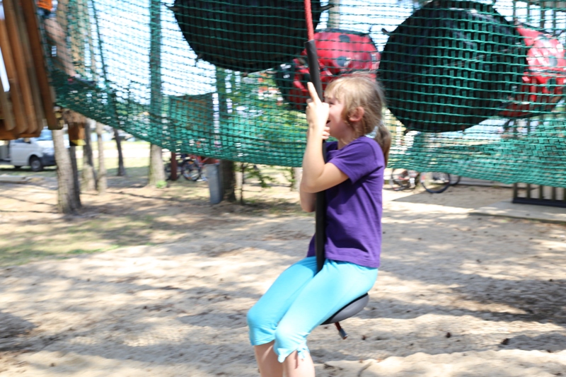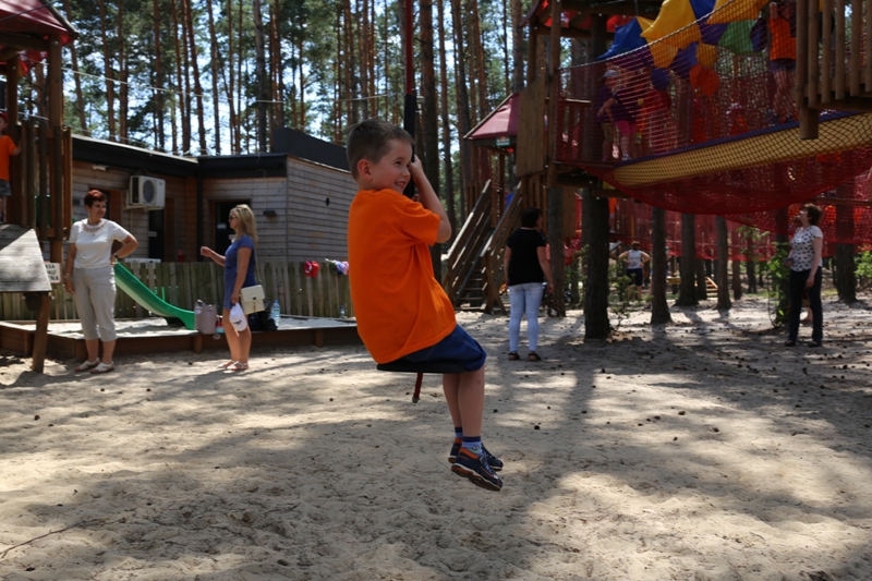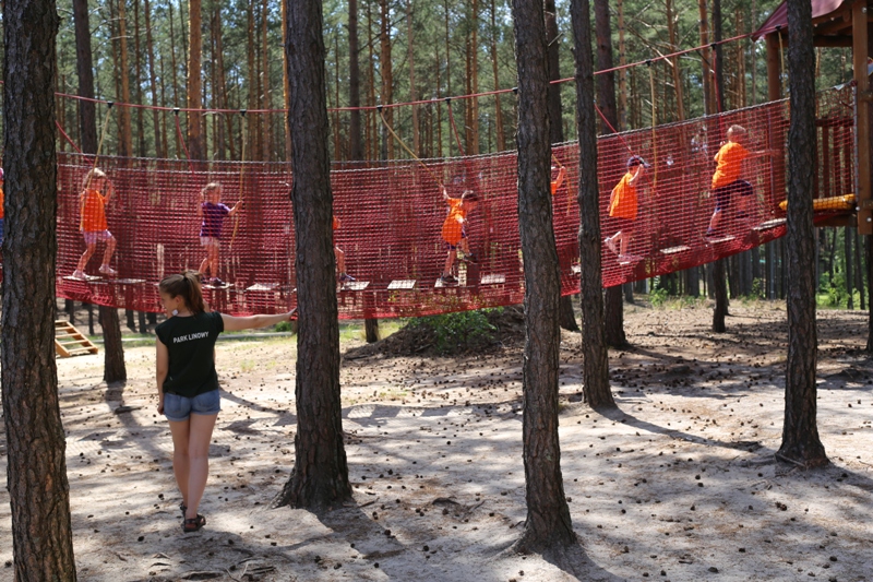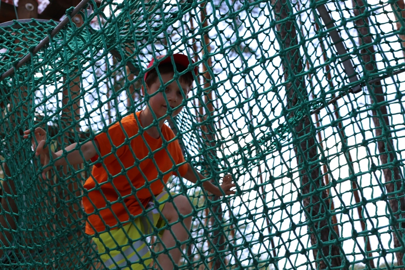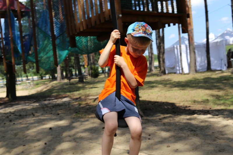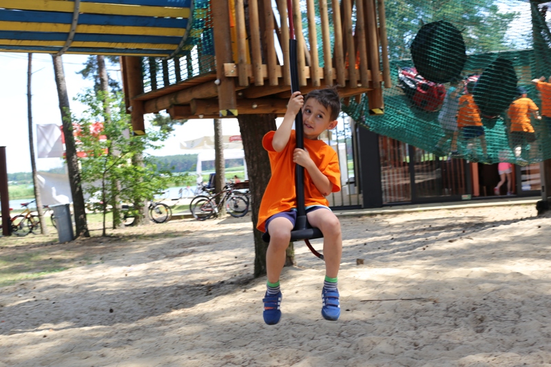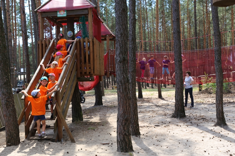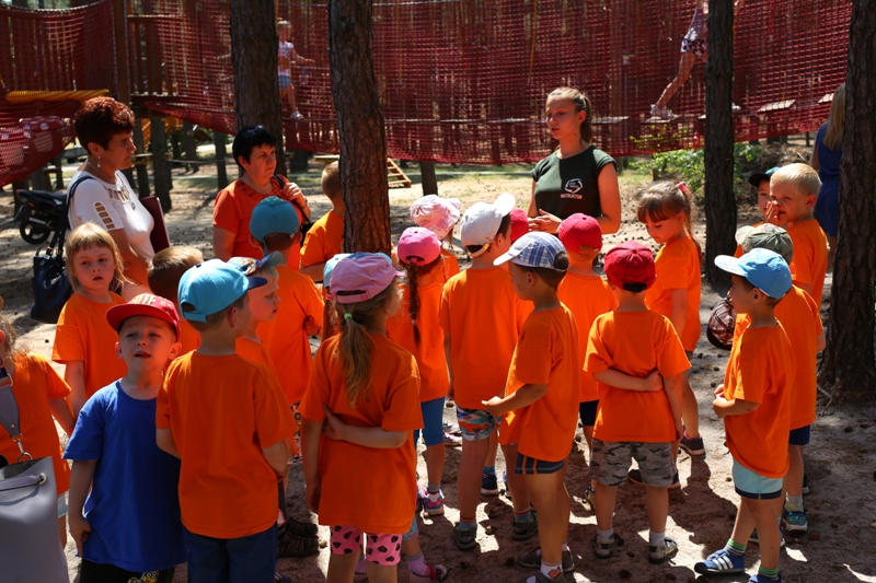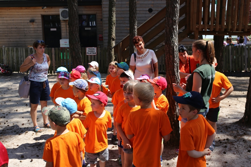 Po konsumpcji obiadu i krótkiej regeneracji, dzieci z Przedszkola Miejskiego w Tarnogrodzie odkrywały uroki parku linowego, gdzie specjalnie dla najmłodszych przygotowano trasę linową z przeszkodami w postaci różnego rodzaju grzybków, podestów, siatek, obręczy i tuneli, a pełne bezpieczeństwo zapewniła siatka asekuracyjna chroniąca przedszkolaki na całej trasie.